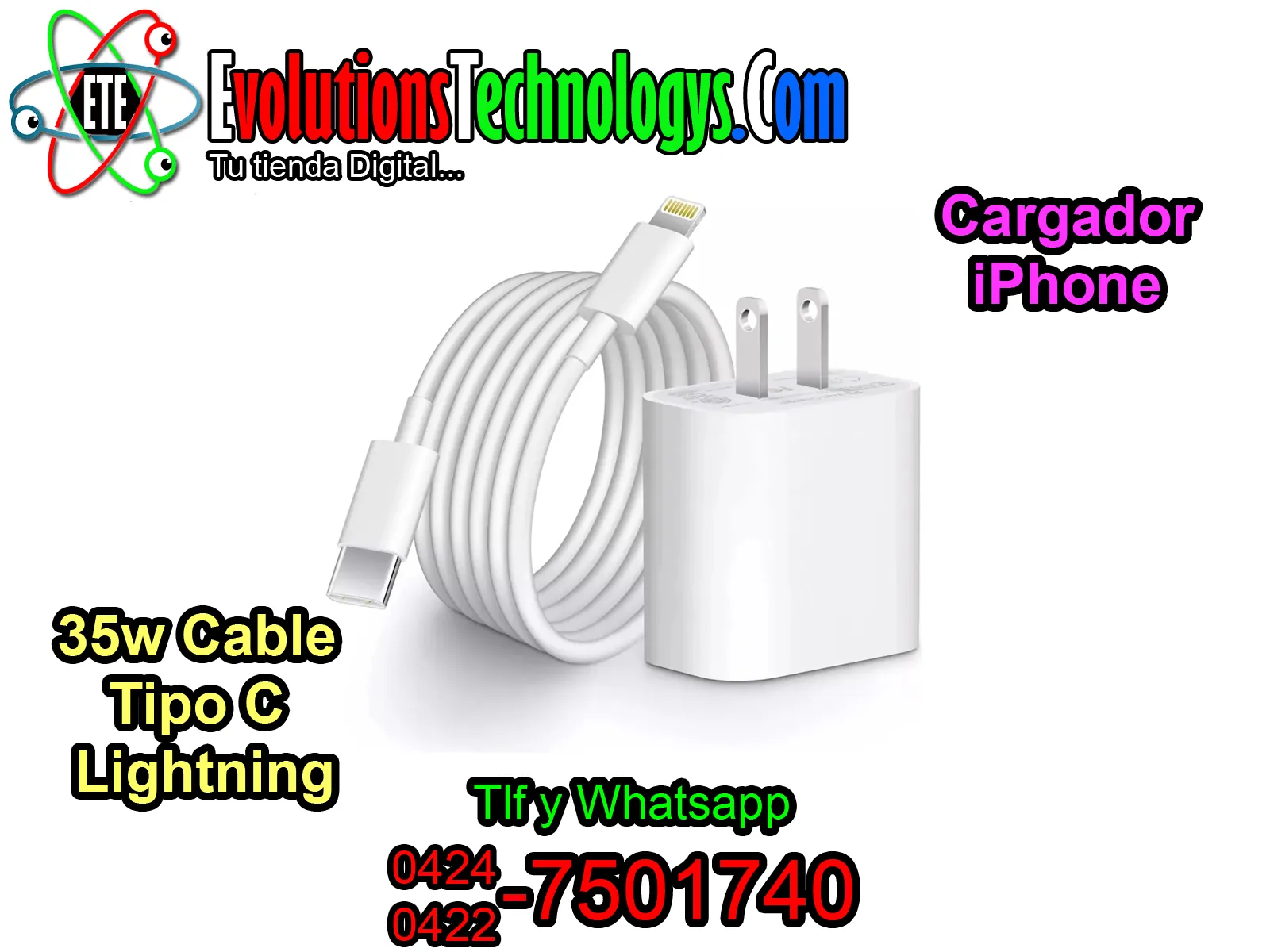 ¡Experimenta la máxima potencia disponible para tu equipo! Con el Cargador de Carga Ultra Rápida de 35W, podrás alimentar tu iPhone a una velocidad sorprendente, reduciendo drásticamente el tiempo de espera junto al enchufe. Este kit premium incluye el cubo de alta capacidad y el cable de Tipo C a Lightning, garantizando una transferencia de energía eficiente y segura. En Evolution Technology, te traemos lo último en rendimiento para que tu iPhone siempre esté listo para la acción. ¡Poder y velocidad sin compromisos! 🚀📱